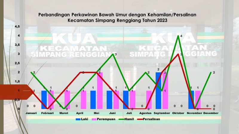 Dalam laporan akhir tahun, KUA Kecamatan Simpang Renggiang Kabupaten Belitung Timur mencatata pernikahan bawah umur tertinggi dari pada kecamatan lainnya yakni sebanyak 18 orang. 7 laki-laki dan 11 perempuan. Bila dibandingkan dengan tahun 2002 hanya mencatat 1 orang perempuan yang menikah dibawah umur, jelas terjadi kenaikan sangat signifikan. Sebaliknya pada tahun 2002, KUA kecamatan Gantung paling banyak mencatat perkawinan bawah umur sebanyak 17 orang, turun drastis pada tahun 2023 sebanyak 6 orang.