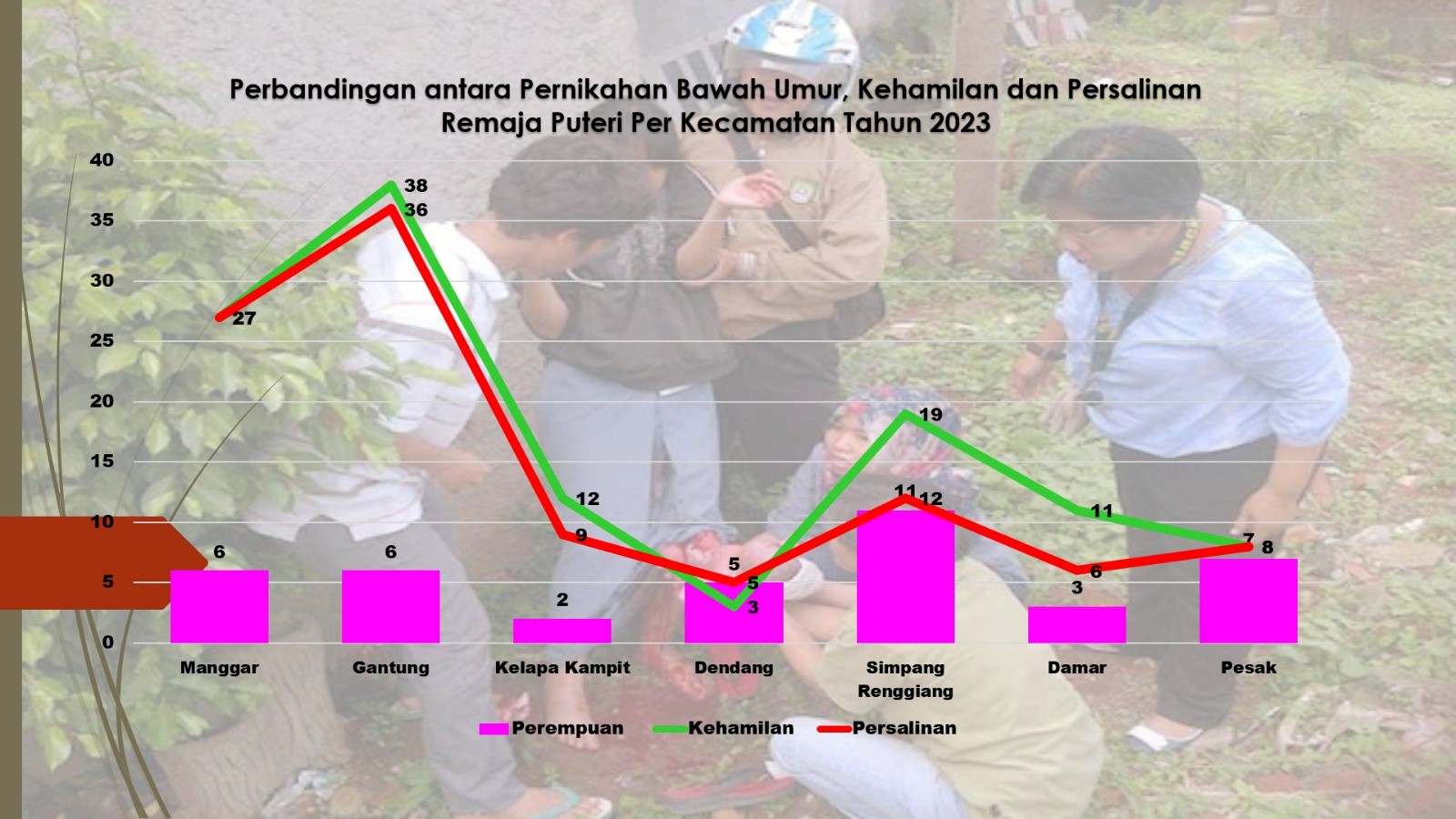 Inilah perbandingan antara Pernikahan Bawah Umur, Kehamilan dan Persalinan Remaja Puteri Per Kecamatan Tahun 2023. Terdapat disparitas  yang cukup jauh antara peristiwa nikah bawah umur yang tercatat di KUA dengan peritiwa kehamilan dan persalinan remaja terutama di Kecamatan Gantung, Kecamatan Manggar. Justeru angka perkawinan bawah umur di Kecamatan Simpang Renggiang tertinggi se-Belitung Timur, namun disparitasnya dengan angka kehamilan dan persalinan rendah