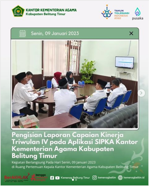Belitung Timur – Kepala Kantor Kementerian Agama Kabupaten Belitung Timur, Drs. Novarianto membuka langsung pertemuan mengenai pengisian laporan kinerja triwulan IV pada aplikasi Sistem Informasi Performa Kementerian Agama (SIPKA) Kantor Kementerian Agama Kabupaten Belitung Timur bersama Kasubag TU, Kasi dan Penyelenggara di lingkungan Kantor Kementerian Agama Kabupaten Belitung Timur, pada Senin (09/01/2023) di ruang pertemuan Kepala Kantor.