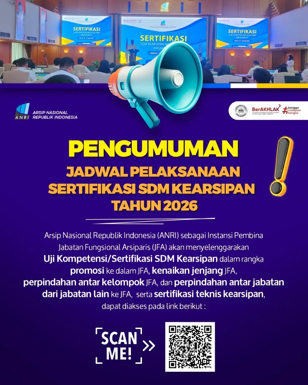 Sertifikasi SDM Kearsipan merupakan salah satu upaya strategis ANRI dalam meningkatkan profesionalisme, kompetensi, dan kualitas pengelolaan arsip sesuai dengan standar nasional kearsipan. Melalui sertifikasi ini, diharapkan SDM kearsipan mampu mendukung terwujudnya tata kelola arsip yang tertib, akuntabel, dan berkelanjutan.