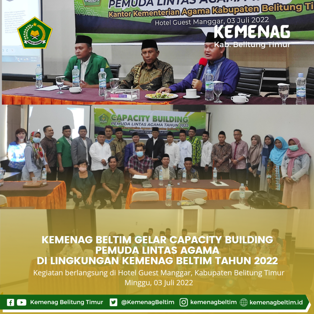 Belitung Timur – Kantor Kementerian Agama Kabupaten Belitung Timur menggelar kegiatan Capacity Building Pemuda Lintas Agama yang digelar di Hotel Guest Manggar, Kabupaten Belitung Timur pada Minggu (03/07). Kegiatan ini dibuka langsung oleh Kepala Kantor Kementerian Agama Kabupaten Belitung Timur, Drs. Novarianto didampingi oleh Kasubag TU, H. As’ari, S. Ag.