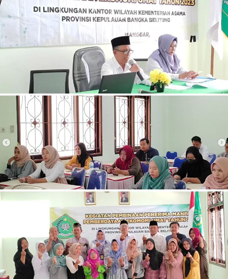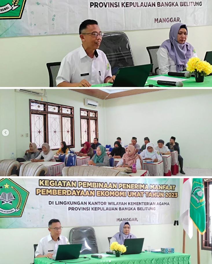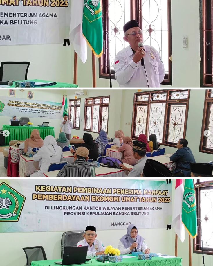 Belitung Timur – Kantor Kementerian Agama Kabupaten Belitung Timur melalui Penyelenggara Zakat dan Wakaf kembali melaksanakan kegiatan Pembinaan Penerima Manfaat Pemberdayaan Ekonomi Umat untuk yang ke-5 (Lima) kalinya, yang dilaksanakan di Aula Kantor Kementerian Agama Kabupaten Belitung Timur, Selasa (26/09/2023). Kegiatan yang dibuka langsung oleh Kepala Kantor Kementerian Agama Kabupaten Belitung Timur, Drs. Novarianto, ini diikuti oleh penerima Bantuan Program Pemberdayaan Ekonomi Umat yang sebelumnya sudah diverifikasi, sehingga tepat sasaran. Kegiatan ini bertujuan untuk membina serta memonitoring perkembangan usaha Penerima Bantuan.