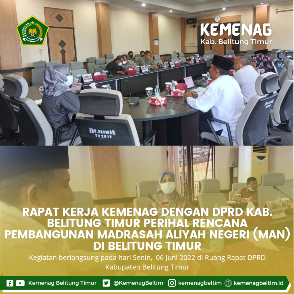 Belitung Timur – Kantor Kementerian Agama Kabupaten Belitung Timur memenuhi undangan Rapat Kerja bersama DPRD Kabupaten Belitung Timur dalam rangka pelaksanaan tugas pokok dan fungsi DPRD Kabupaten Belitung Timur pada bidang pengawasan pada hari Senin (06/06) di Ruang Rapat DPRD Kabupaten Belitung Timur. Rapat yang dipimpin oleh Wakil Ketua DPRD Kab. Beltim Rohalba, S.Pt., ini berkenaan dengan rencana pembangunan Madrasah Aliyah Negeri (MAN) di Kabupaten Belitung Timur dan membahas mengenai Kuota Haji di Kabupaten Belitung Timur. Rapat dihadiri oleh Kepala Kantor Kementerian Agama Kabupaten Belitung Timur, Drs. Novarianto didampingi oleh Kasubbag Tata Usaha, H. As’ari, S. Ag dan Kasi Penmad, Amizan Wardi, S. Pd.I beserta Kasi PHU Kemenag Beltim, Hasmaryati, S. Ag.