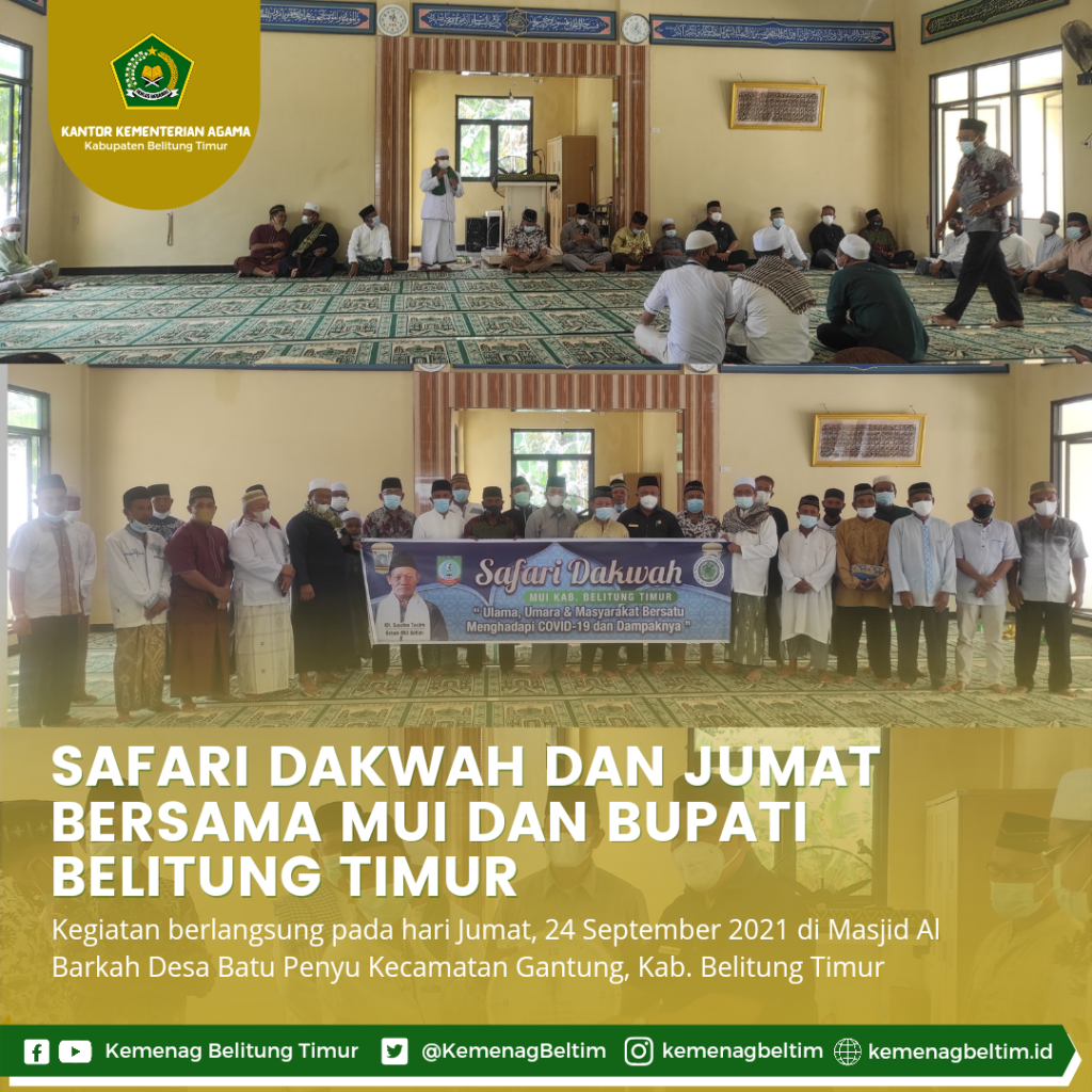 Kepala Kantor Kementerian Agama Kabupaten Belitung Timur Drs. Novarianto bersama Kasubag Tata Usaha H.As’ari,S.Ag mengikuti Safari Dakwah oleh MUI Kabupaten Belitung Timur pada hari Jumat, 24 September 2021 di Masjid Al Barkah Desa Batu Penyu Kecamatan Gantung, Kabupaten Belitung Timur. Turut hadir juga Bupati Belitung Timur Drs. Burhanudin beserta Wakil Bupati Belitung Timur Khairil Anwar yang sekaligus menyerahkan bantuan dari Pemda Kabupaten Belitung Timur kepada Masjid Al Barkah. Acara diawali dengan Kegiatan Sholat Jumat bersama. Kecamatan Gantung merupakan Kecamatan kedua dalam rangkaian acara Safari Dakwah yang digelar oleh MUI Kabupaten Belitung Timur dari tujuh Kecamatan yang akan menggelar kegiatan serupa.
