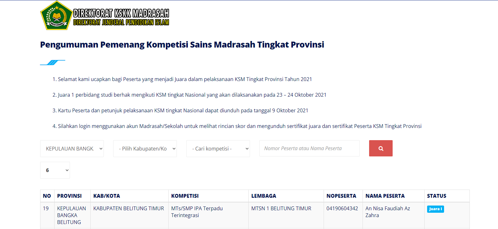 - Mustakim, S. Pd., Guru MTsN 1 Belitung Timur yang membimbing Nisa Faudiah Az Zahra memperoleh Juara I Kompetisi IPA Terpadu Terintegrasi KSM Tahun 2021 Tingkat Provinsi Kepulauan Bangka Belitung.